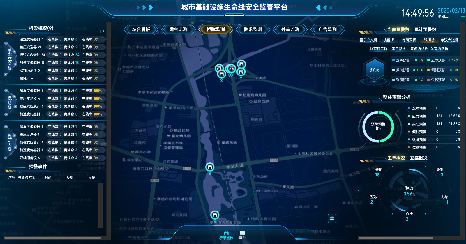 孝感市城市運行管理服務平臺(以下簡稱“平臺”)是響應住建部要求建設的標桿項目,旨在通過物聯網、大數據、人工智能等技術,實現城市生命線基礎設施的實時監測與風險預警,提升城市安全運行能力。平臺于2024年4月試運行,同年7月通過預驗收,其中橋梁安全監測系統作為核心模塊,覆蓋主城區14座橋梁,形成“監測—預警—處置—整改”閉環管理體系,顯著提升橋梁安全監管效能。