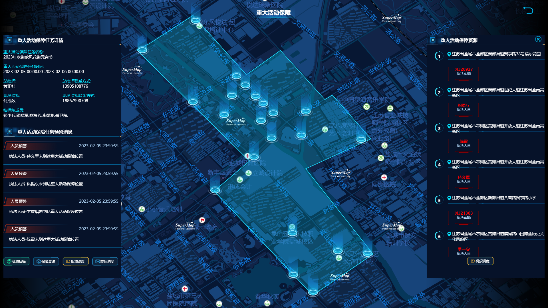 根據城市管理一線任務特點,開發了實用性很強的重大活動保障應用場景,在遇到重大活動保障任務時,快速在地圖上繪制保障區域,同時在區域內布控人員、車輛力量。當保障活動開始時,在指揮中心就能看到布控的人員、車輛是否到位,利用融合通信,通過視頻連線、語音對講、群發短信等方式對現場保障的人員、車輛進行調度,需要時還可以緊急調度增援力量,真正做到任務指令“秒”級到達,處置“分”級實施,結果“時”級反饋,快速聯動。