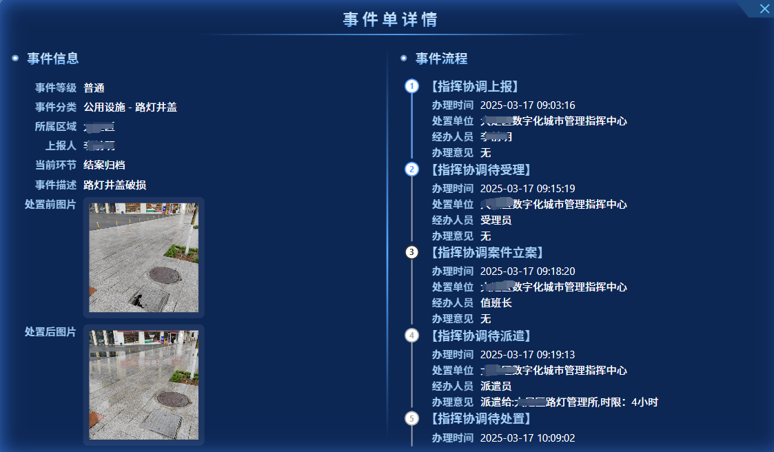 窨井蓋事件處置。事件多源感知,以窨井蓋問題發(fā)現(xiàn)多元化,事件處置高效化為目標(biāo),在采集員上報(bào)、熱線舉報(bào)基礎(chǔ)上拓展掃碼上報(bào)、物聯(lián)感知等多源上報(bào)渠道。高效閉環(huán)處置,打造從事件發(fā)現(xiàn)到結(jié)案的多跨協(xié)同全過程處置場(chǎng)景和可視化高效閉環(huán)處置機(jī)制,使窨井蓋問題發(fā)現(xiàn)率提高60%,事件處置時(shí)效提升50%以上。