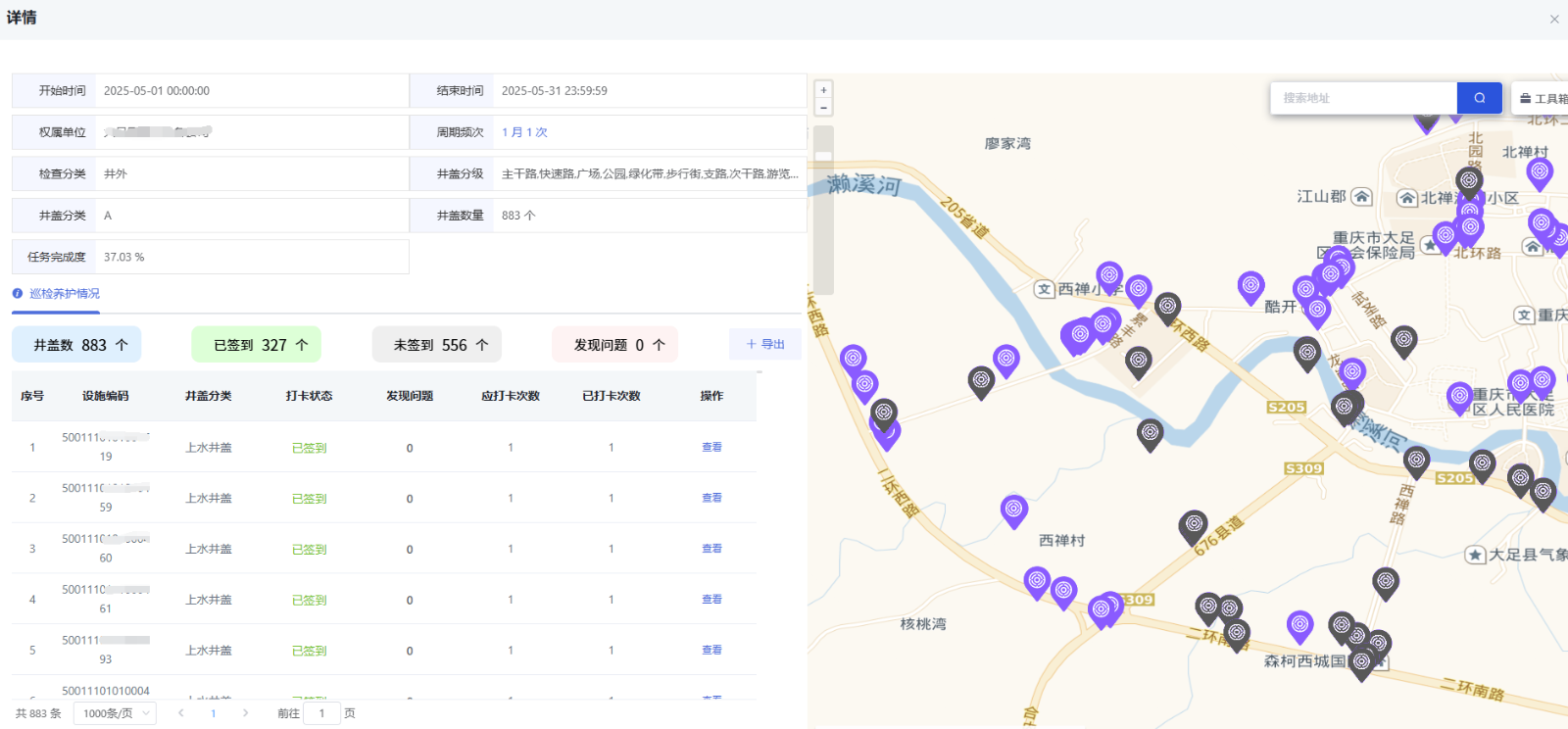 窨井蓋運(yùn)維管理。據(jù)窨井蓋類型定制巡檢頻次,自動(dòng)生成巡檢養(yǎng)護(hù)周期計(jì)劃,解決了原來業(yè)務(wù)主管部門巡檢制度缺失、落實(shí)缺位、頻率低下等問題,強(qiáng)化業(yè)務(wù)主管部門主體責(zé)任,全面實(shí)現(xiàn)巡檢任務(wù)鏈條化。
